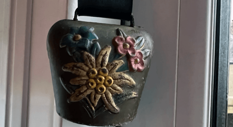 One of the bells on my antique Swiss style bells that hang inside The Cosy door. I believe bells clear the air of negative energy and hang on the inside of all my outside doors. I often give them as housewarming gifts.